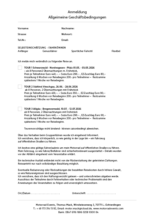 Bitte mit vollgetanktem und technisch einwandfreien Motorrad erscheinen.